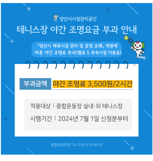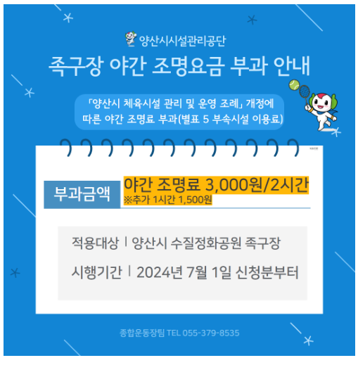 족구장과 테니스장을 야간에 사용할 시 야간 조명요금이 부과된다는 소식입니다.