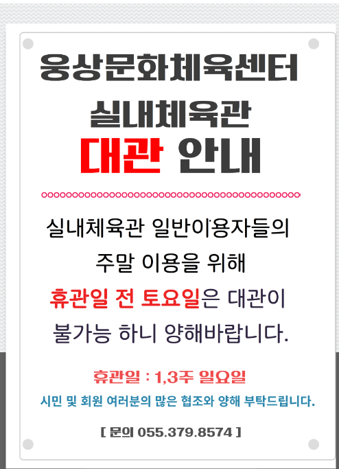 실내체육관 대관은 일반이용자들의 주말 이용을 위해 휴관일 전 토요일은 대관이 불가능하다고 합니다.