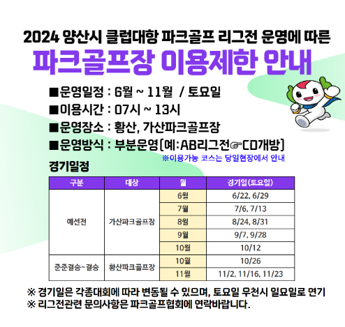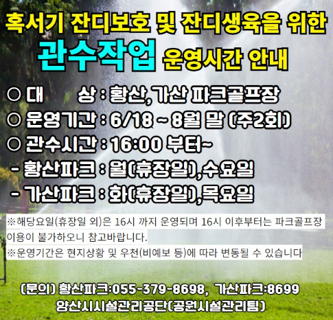 잔디보호 및 잔디생육을 위한 관수작업으로 파크골프장 운영이 휴장일과 수요일 또는 목요일은 16시 이후는 이용이 불가합니다.