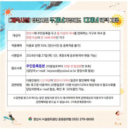 체육시설을 두자녀 가정이상 미성년자를 둔 양산시민이면 이용료가 50퍼센트 감면이 된다는 소식입니다. 위에 내용을 참고하여 미리 증빙서류를 발송해야 혜택을 받을 수 있습니다.
