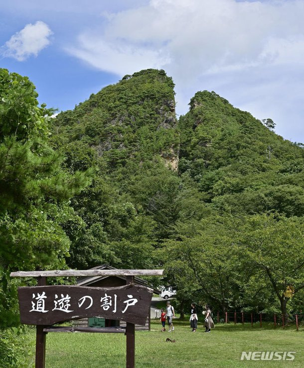 [니가타=AP·교도/뉴시스] 일본 니가타현 사도시 '사도광산'은 '니시미카와긴잔(西三川砂金山)'과 '아이카와쓰루 시긴 긴 잔(相川鶴子金銀山)' 등 2개로 구성돼 있다. 사진은 2021년 8월 19일 사도광산의 상징적인 채굴터인 아이카와쓰루시 긴긴 잔의 '도유노와리토(道遊の割戸)'의 모습. 2024.06.07.