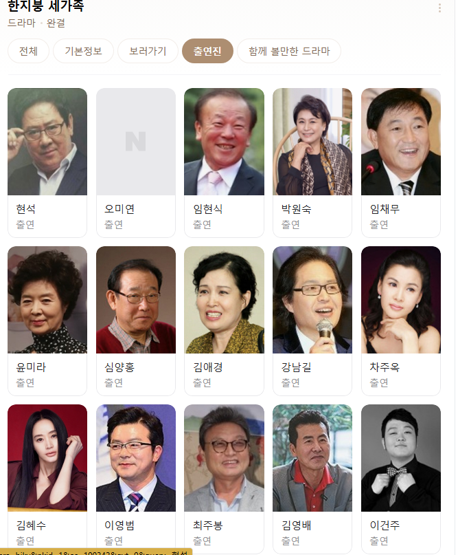 - 할머니 (정애리 분): 가족의 중심인 할머니로, 각 가족 구성원들의 고민과 갈등을 따뜻하게 해결해주는 역할을 맡았습니다.