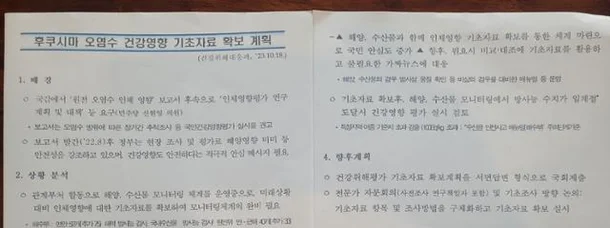 - 방류 1년이 지났지만, 기초자료 확보는 여전히 진척이 없는 상태입니다. 질병청은 기초자료 확보와 조사 방법을 구체화하겠다고 했으나, 실질적인 조치는 이루어지지 않았습니다. 방류 초기에는 해당 연구와 조사의 필요성이 언급되었으나, 이후에는 관련 논의가 거의 거론되지 않고 있습니다.