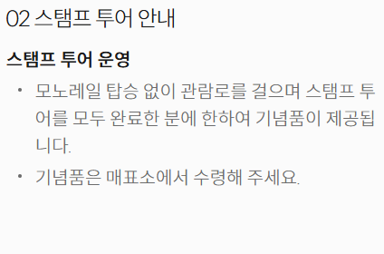 2. 스탬프 투어가 따로 있으니 모노레일 탑승 없이 관람로를 걸으며 스탬프 투어를 모두 완료하시면 기념품을 제공합니다. 기념품은 매표소에 수령하시면 됩니다.