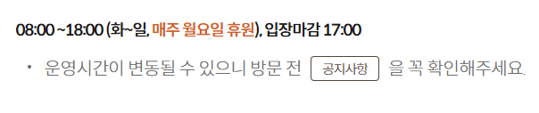 4. 매주 월요일 휴원이고 입장마감은 오후 5시라고 합니다. 변경될 시 공지사항을 참고하시면 됩니다.