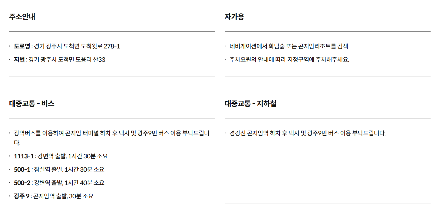 5. 오시는 길은 자가용으로 화담숲 또는 곤지암리조트를 검색하시고 대중교통은 광역버스나 곤지암터미널 하차 후 택시 및 광주 9번 버스를 이용하시기를 바랍니다. 지하철은 경강선 곤지암역 하차 후 택시 및 광주 9 번번 버스 이용 바랍니다.