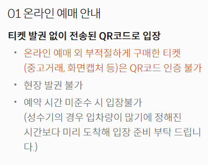1. 티켓 발권 없이 전송된 QR코드로 입장하시면 됩니다. 단 예약 시간 미준수 시 입장 불가하니 미리 도착해 입장준비하시길 바랍니다.