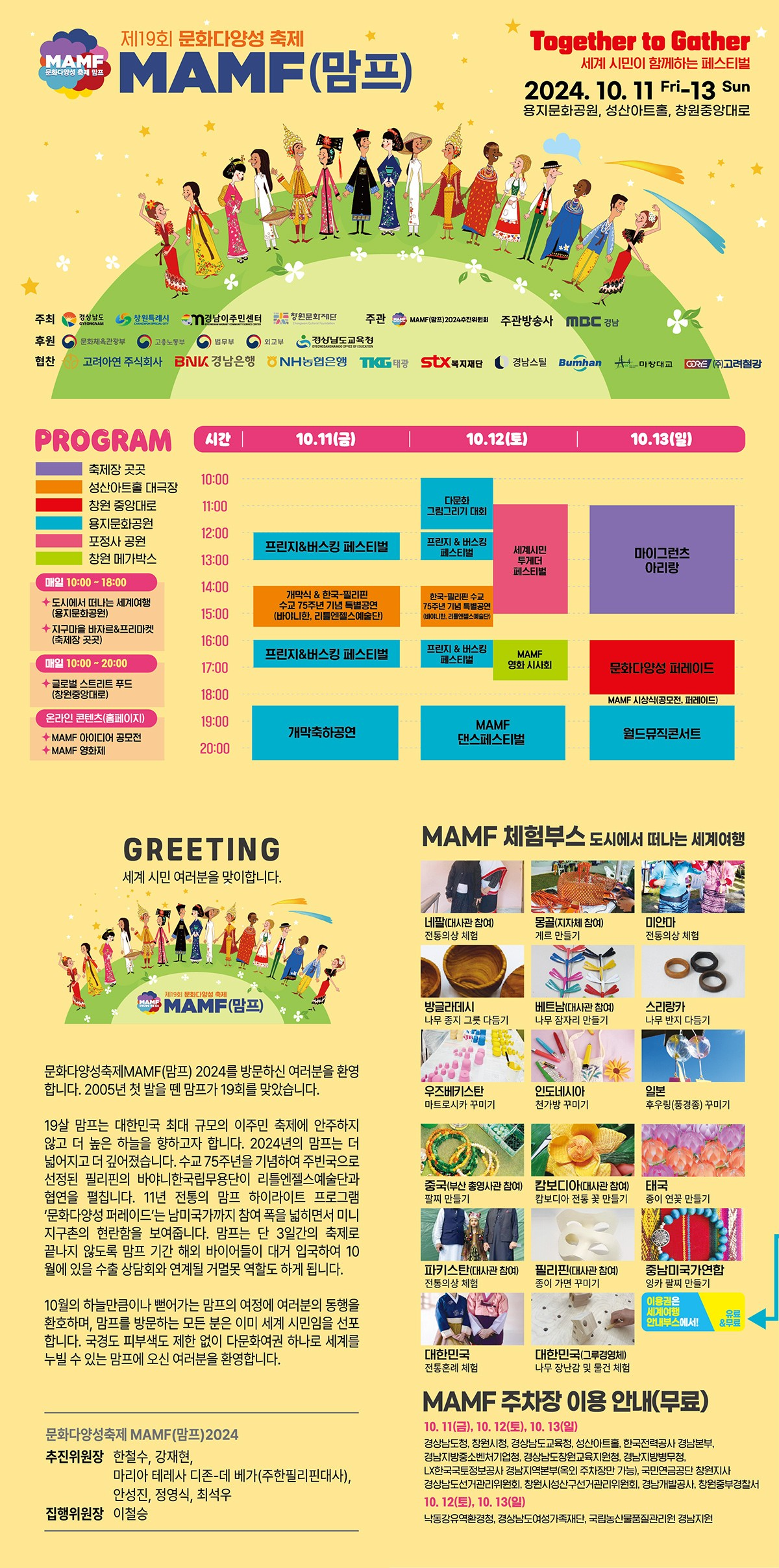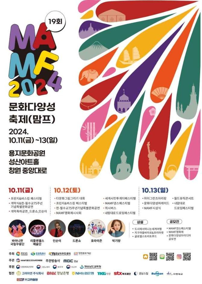 안녕하세요! 오늘은 곧 열릴 **문화다양성축제 MAMF(맘프)**에 대해 소개해 드리려고 합니다. 이번 축제는 11일부터 13일까지 창원 용지문화공원, 포정사공원, 성산아트홀, 중앙도로 일원에서 진행됩니다.