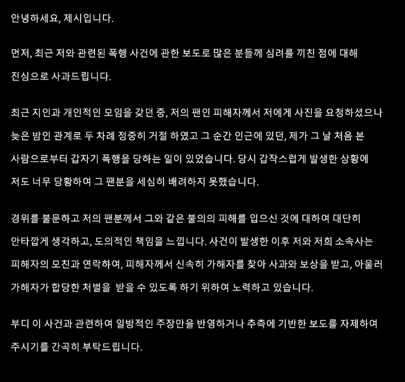 제시는 사과문에서 “이 사건과 관련해 일방적인 주장만을 반영하거나 추측에 기반한 보도를 자제해 주시기를 간곡히 부탁드린다”고 덧붙이며, 상황이 더 이상 확대되지 않기를 당부했습니다.