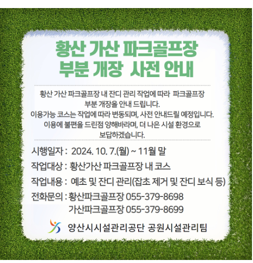 황산 가산 파크골프장이 10월부터 잔디관리작업으로 부분개장을 할 수 있다는 소식입니다. 원하는 코스가 있을 시에 전화를 해보시는 것이 좋겠습니다.