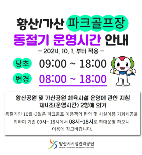 황산 가산 파크골프장이 10월부터는 한 시간 앞당겨 오픈한다는 소식입니다. 동절기 내내 지속된다고 하니 10월에서 3월까지 적용합니다.