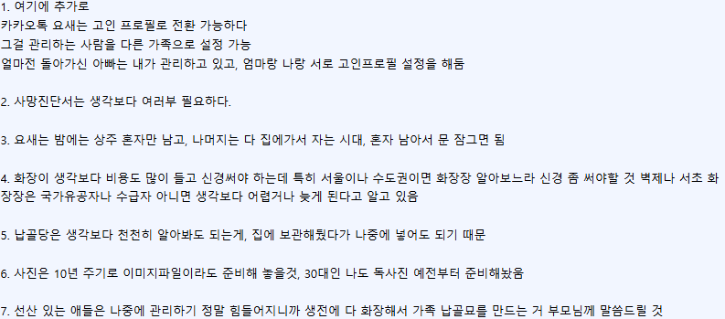 - 부고 문자 발송: 오랜만에 연락하는 사람들에게는 부담이 될 수 있으니, 정말 필요한 사람들에게만 연락합니다.