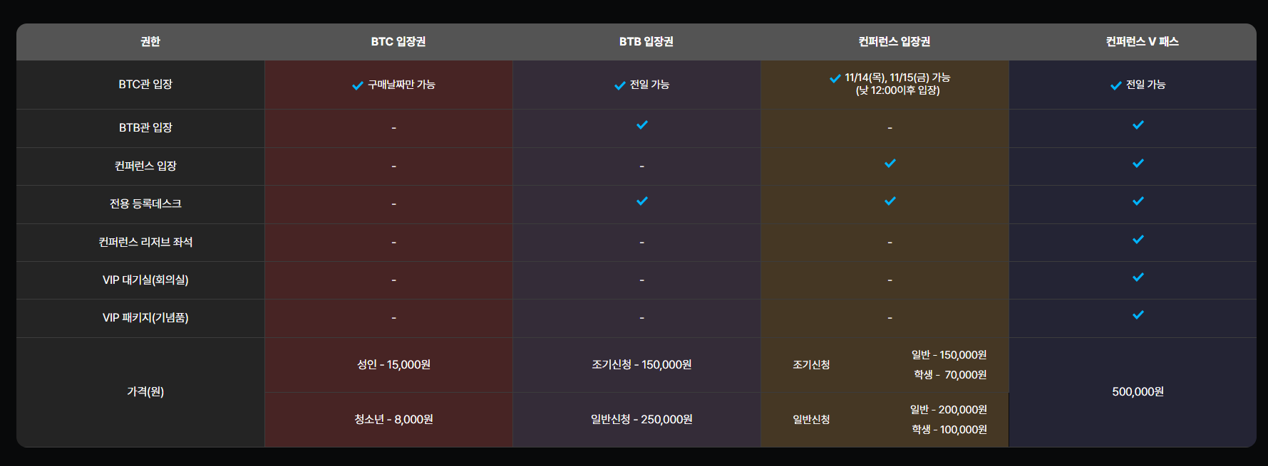 나머지 BTB 입장권과 컨퍼런스 입장권은 공식사이트에 로그인 후에 구매하실 수 있습니다.