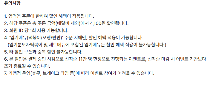 - 이용 방법: 엽떡앱에서 쿠폰 다운로드 후 주문 결제 단계에서 쿠폰 적용
