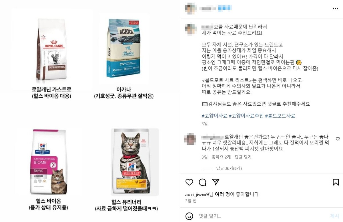 문제 사료 의혹 확산 직후 게시되는 사례가 늘자, "제 고양이에게 먹일 수 없는 사료를 다른 고양이 먹으라고 판매한다"는 비판이 쏟아지고 있다.
