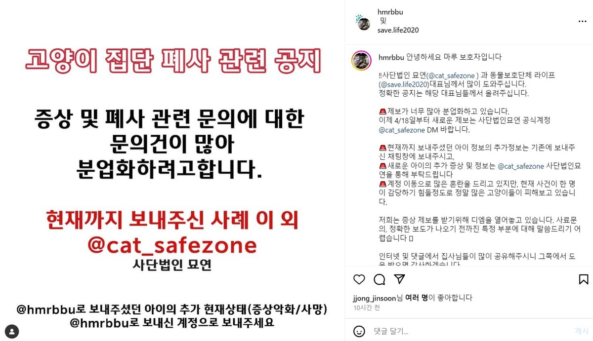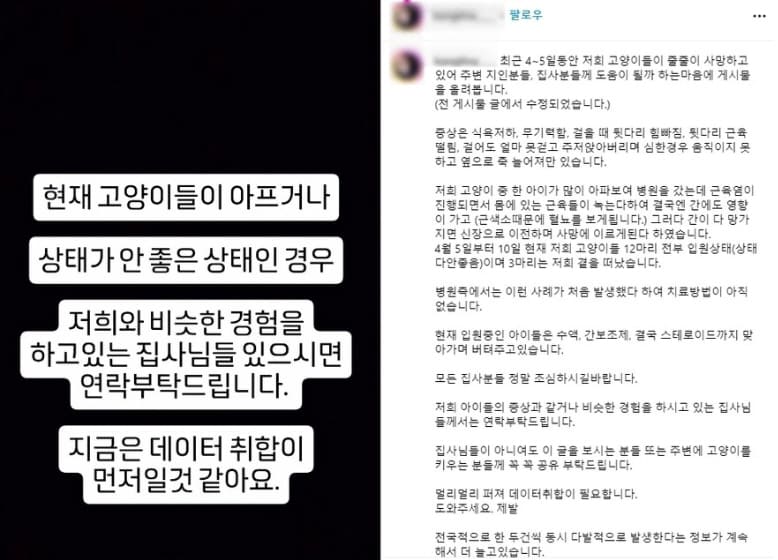 처음 사건을 알린 피해묘의 보호자님 인스타에서 고양이 급사와 관련된 제보를 받고 있습니다.
