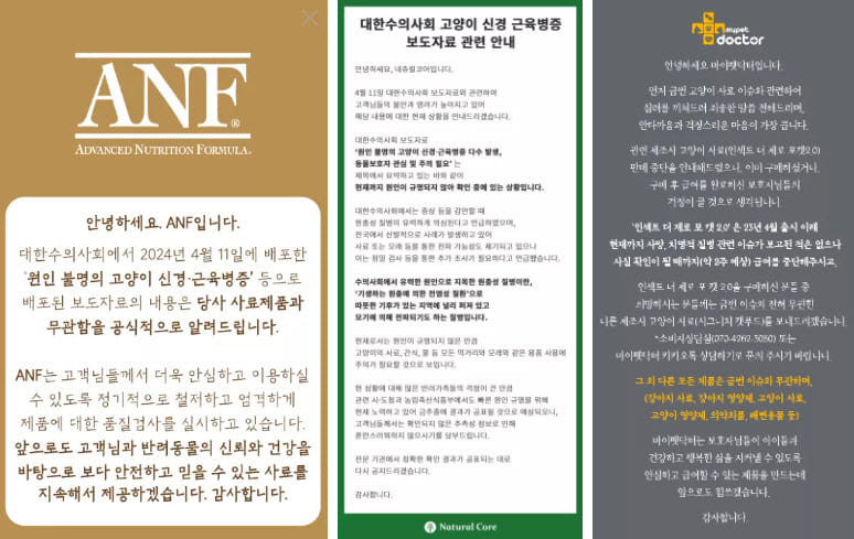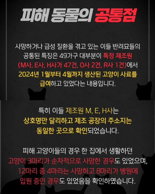 한편, 해당 논란은 최근 사회관계망서비스(SNS)를 통해 한 가정에서 지내던 고양이 12마리가 동시에 신경증을 앓다가 그중 3마리가 사망한 사실이 알려지며 시작됐다. 이후 국내 동물병원을 중심으로 비슷한 증상을 겪고 있는 사례가 다수 보고돼 고양이를 키우는 가정에서 불안감이 높아진 것이다. 주요 증상은 식욕 저하, 기립 불능, 근 색소뇨 등으로 신경·근육병증의 질병이 나타나는 것으로 알려졌다.