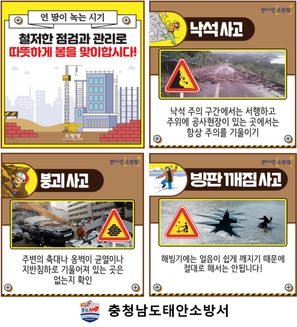 이 시기에는 낙석, 지반 침하, 붕괴, 빙판길 사고, 건설현장 안전사고 등이 많이 발생하므로 각별한 주의가 필요합니다.