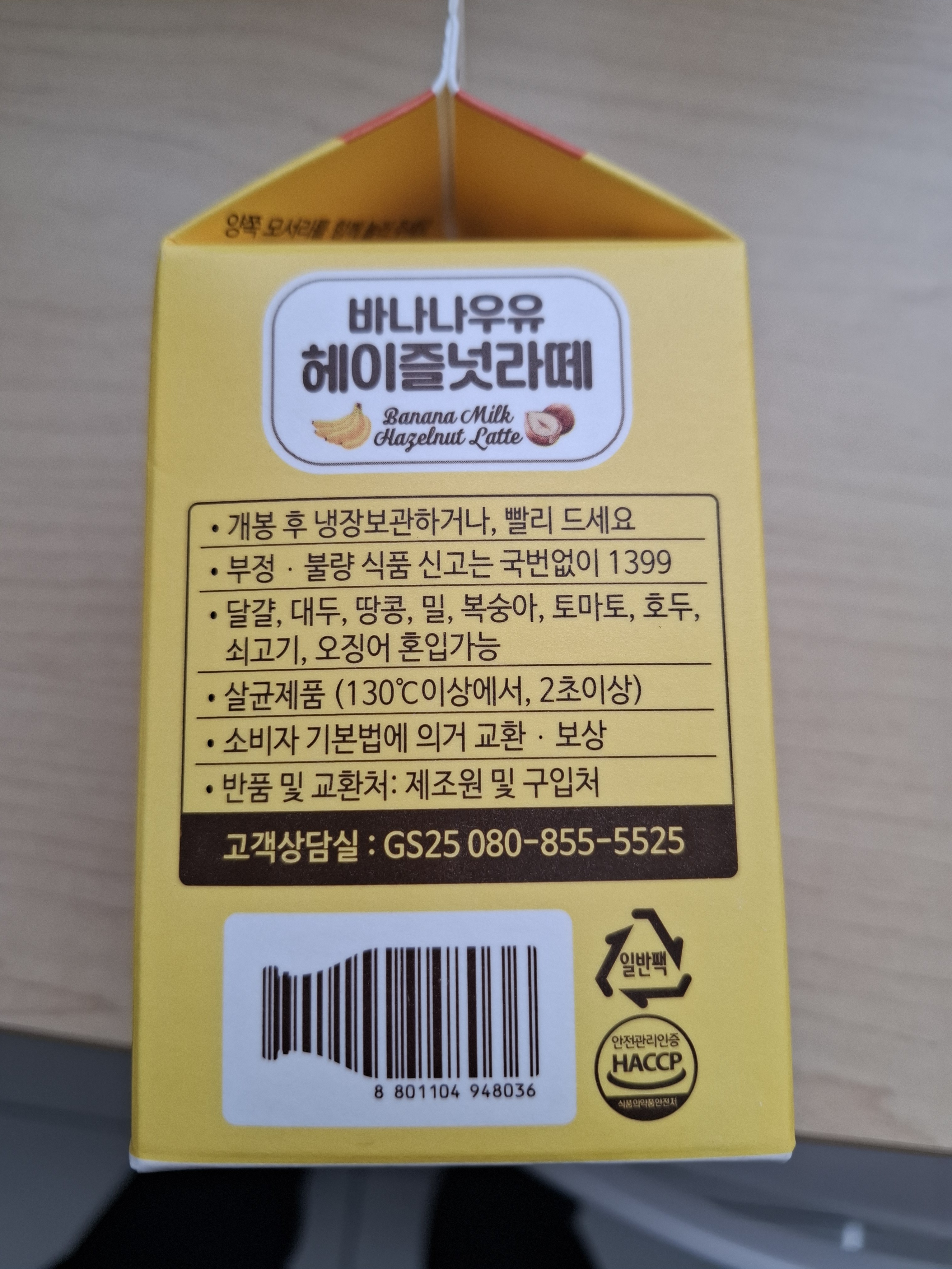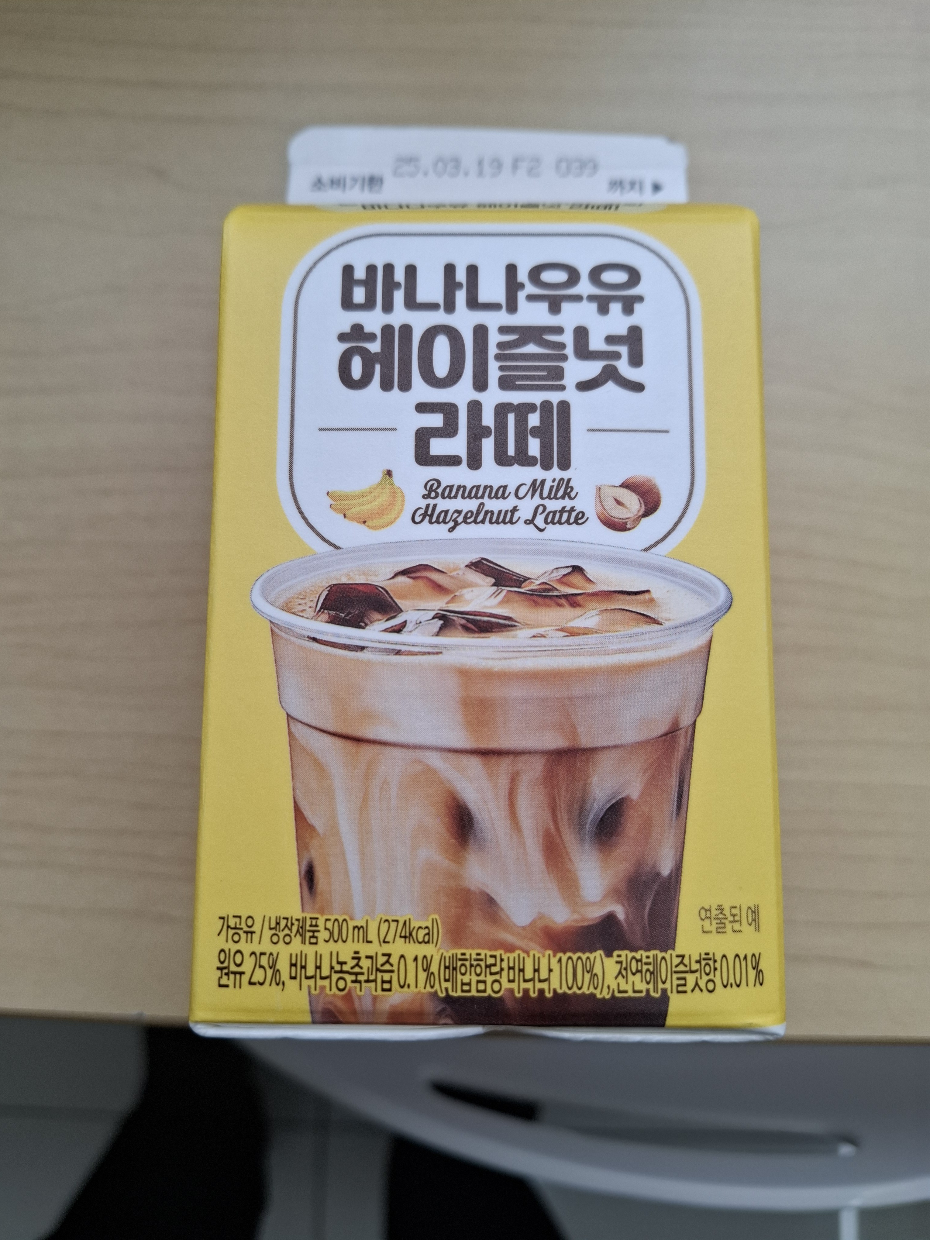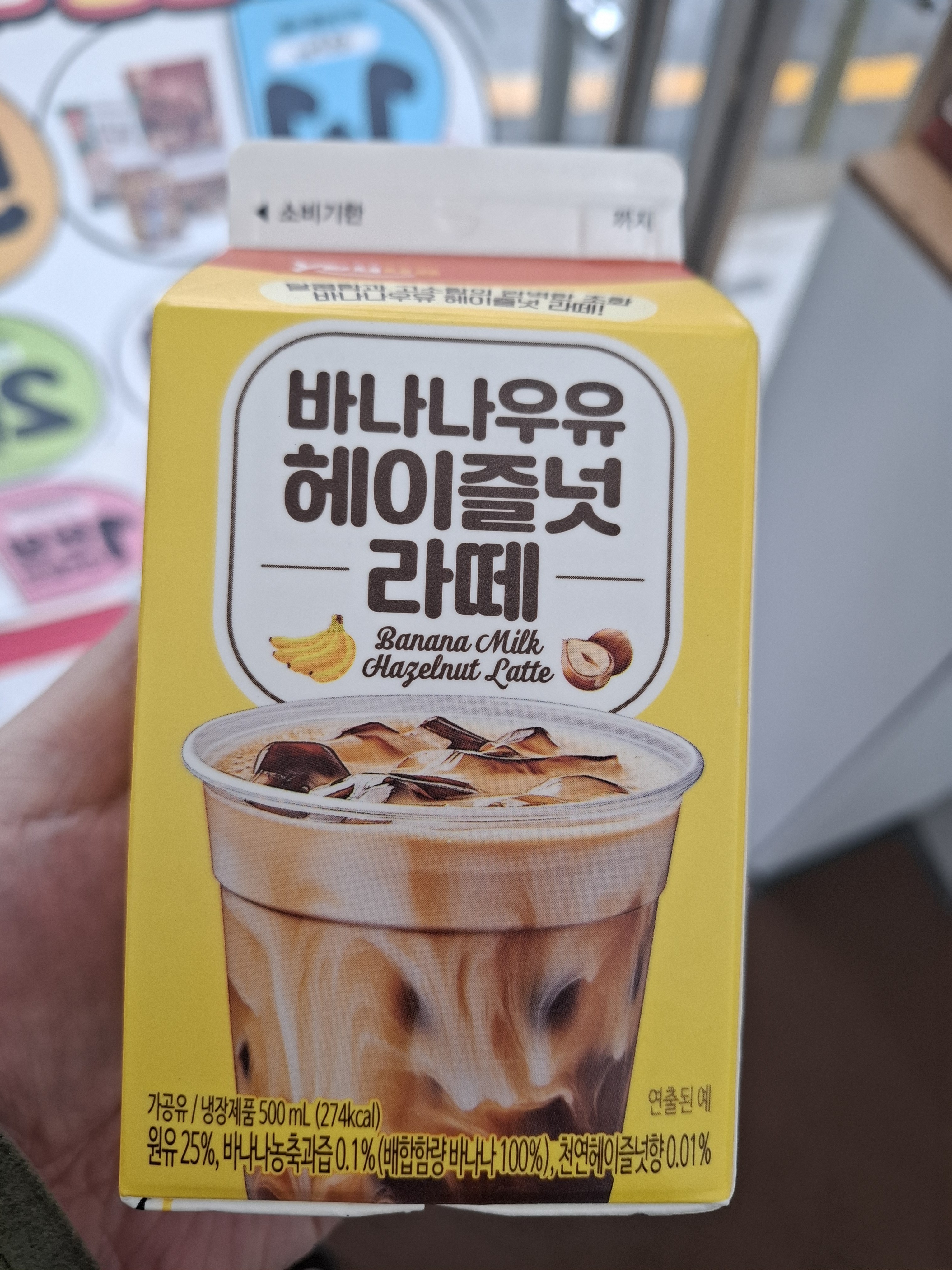 패키지가 너무 귀엽고 세련됐어요. 바나나우유 특유의 노란색 바탕에 ‘헤이즐넛 라떼’라고 적혀 있어서 뭔가 더 고급스러운 느낌? 딱 보기에도 바나나우유 + 커피 조합이구나 싶었어요.