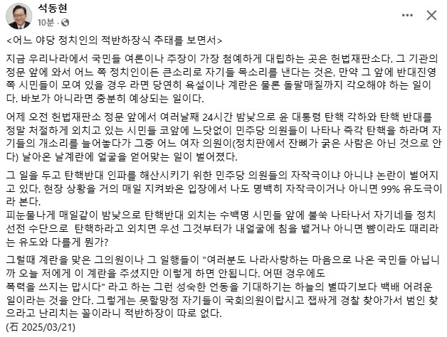 그동안 정치적 견해를 표현하는 건 자유이지만, 최소한 사실과 증거에 입각해야 합니다. 석 변호사는 변호사로서의 본분을 망각하고 국민적 갈등을 부추긴 책임에서 결코 자유로울 수 없습니다.