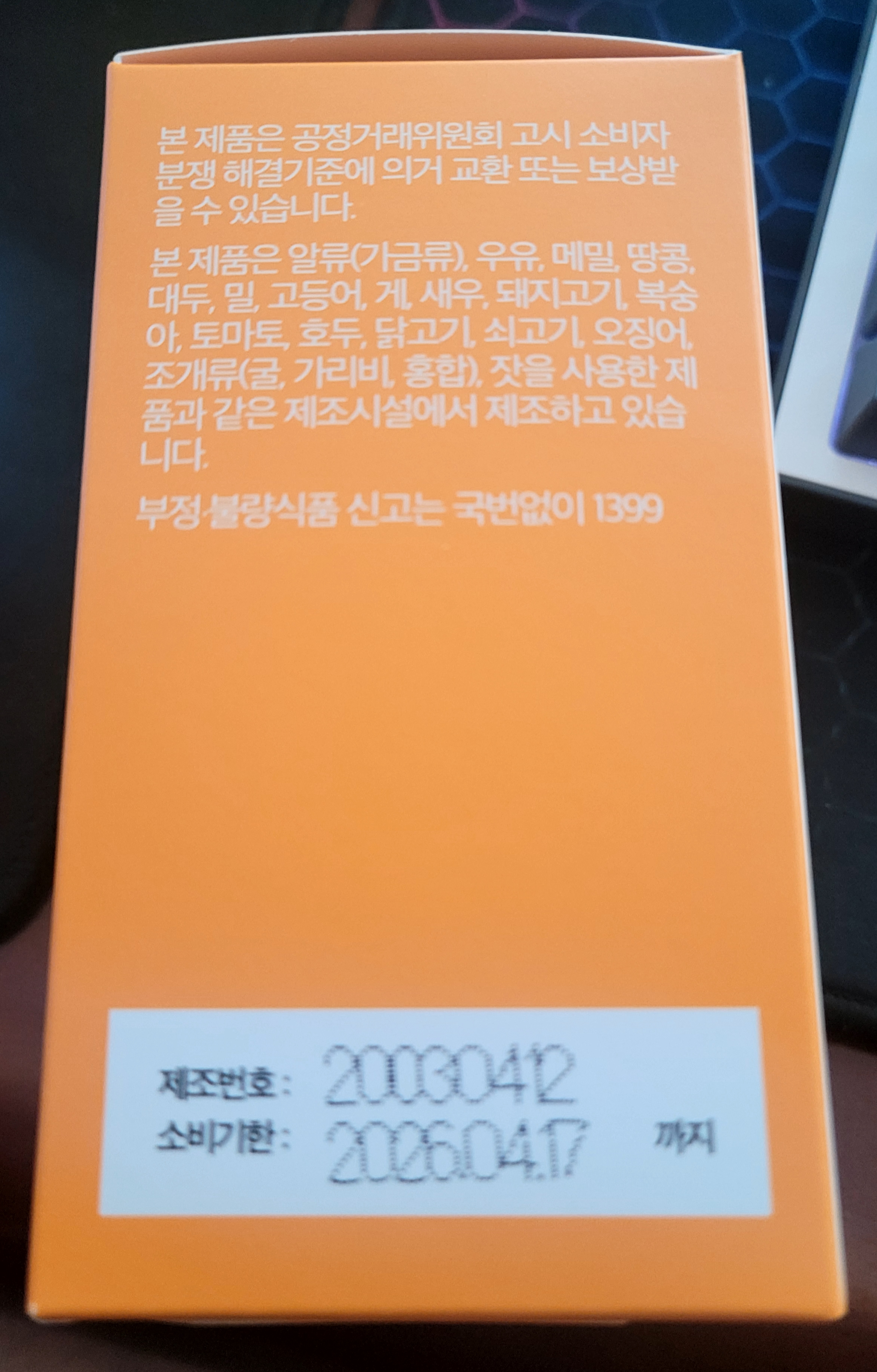 혹시나 저기 위에 알류,우유,메밀,땅콩,대두,밀,고등어,게,새우,돼지고기,복숭아,토마토,호두,닭고기,쇠고기,오징어,조개류,잣 알러지 있으시분은 주의 하시기 바랍니다. 소비기한은 2년이니 2년안에는 다 드셔야합니다.\