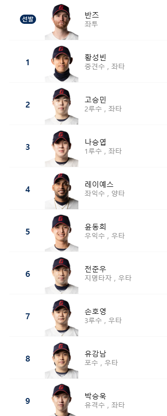 | 3 | 나승엽 | 1루수 | 좌타 | 4 | 3 |