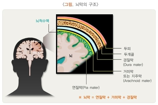 뇌수막염은 뇌와 척수를 둘러싼 ‘뇌막(뇌수막)’에 염증이 생기는 질환입니다.