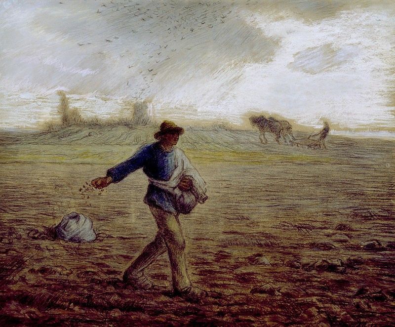 그는 진흙탕 속에서 씨를 뿌리고, 땅을 일구고, 이삭을 줍는 사람들을