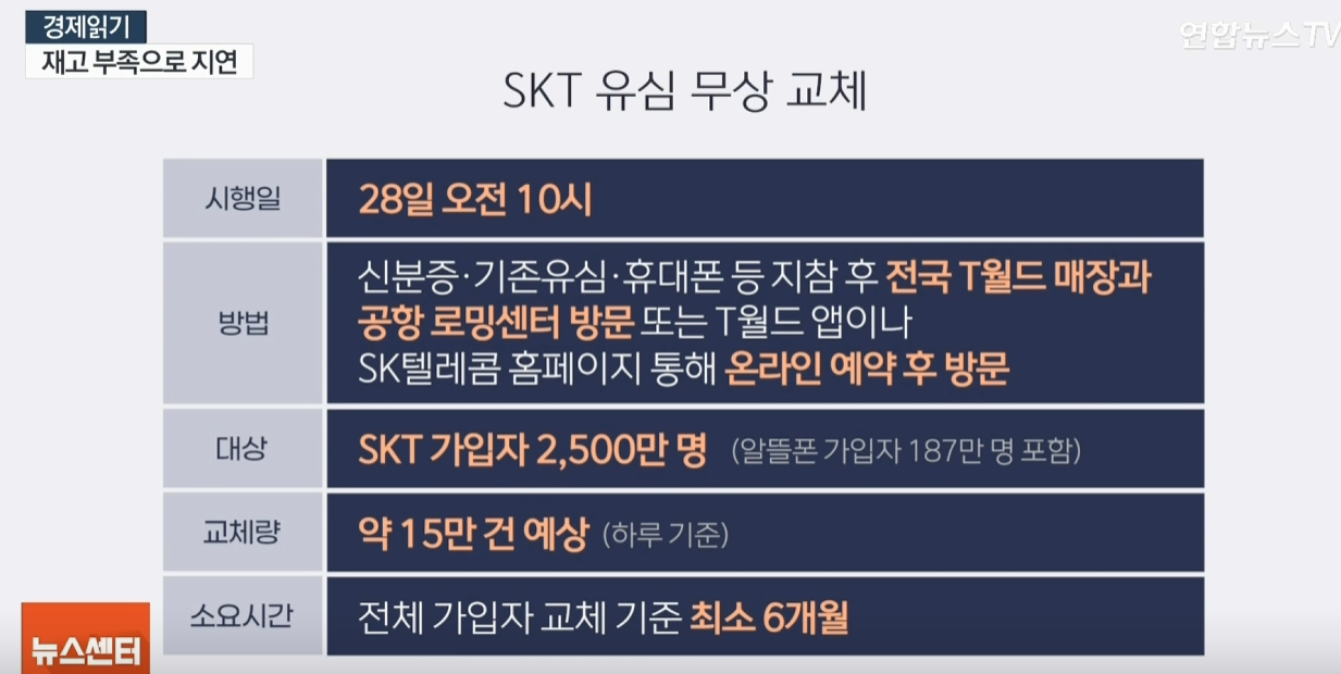 또는 SK텔레콤 홈페이지/T월드 앱에서 온라인 예약 후 방문 - 교체량: 하루 약 15만 건 예상