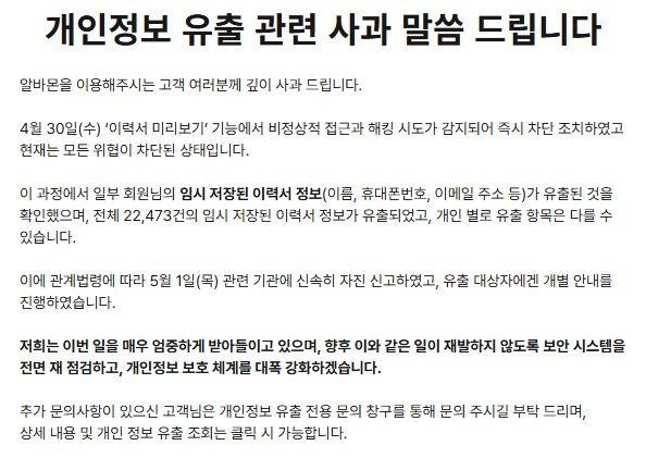 알바몬은 해킹 시도를 즉시 차단하고, 5월 1일 개인정보보호위원회에 자진 신고, 유출된 회원에게 이메일 안내를 보냈습니다.