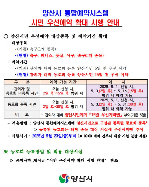각종 체육시설은 기본적으로 양산시민 우선예약제를 시행하고 있습니다. 그리고 관외이용객은 양산시민 예약 후 며칠이 지난 후에 예약을 시작합니다.