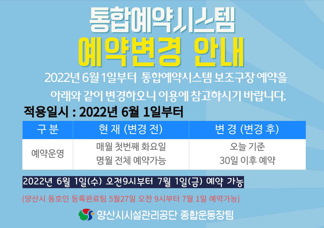 양산시 체육시설과 시설대관을 할 때는 양산시통합예약시스템을 이용해야 합니다. 그리고 이번 5월부터 예약에 변경이 생겨 알려드리고자 스토리를 쓰게 되었으며 체육시설을 하는 방법 또한 설명드리겠습니다.