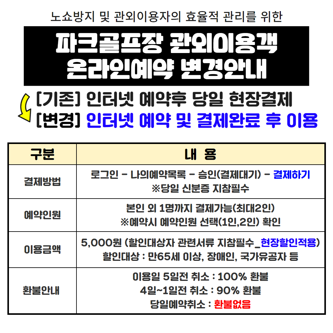 최신 소식으로 파크골프장 관외이용객 온라인 예약을 변경이 되었습니다. 파크골프장이 4월 23일부터 예약이 가능해졌고 관외이용객은 4월 25일 10시부터 예약을 시작하게 되는데 기존은 예약만 하면 되었지만 노쇼가 많아서 그런지 인터넷 예약과 결제까지 완료해야 한다는 것입니다.