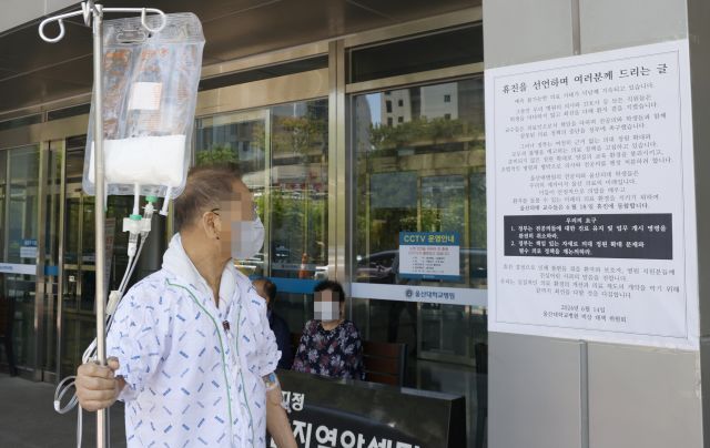 대한의사협회가 의대 증원 등 의료개혁을 규탄하는 집단 휴진에 나선 18일 오후 울산 동구 울산대병원 본관입구에 한 환자가 휴진을 선언하며 시민들에게 드리는 문구를 바라보고 있다. 뉴시스