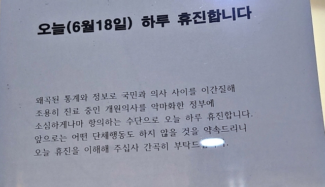 바로 옆 내과 의원을 찾은 최모(43)씨는 “저런 걸 붙여놓으면 환자들이 의사를 이해해 줄 거로 아는가 보다”며 “이런 상황에서도 휴진에 동참하지 않는 병원들이 그저 고마울 뿐”이라고 말했다.